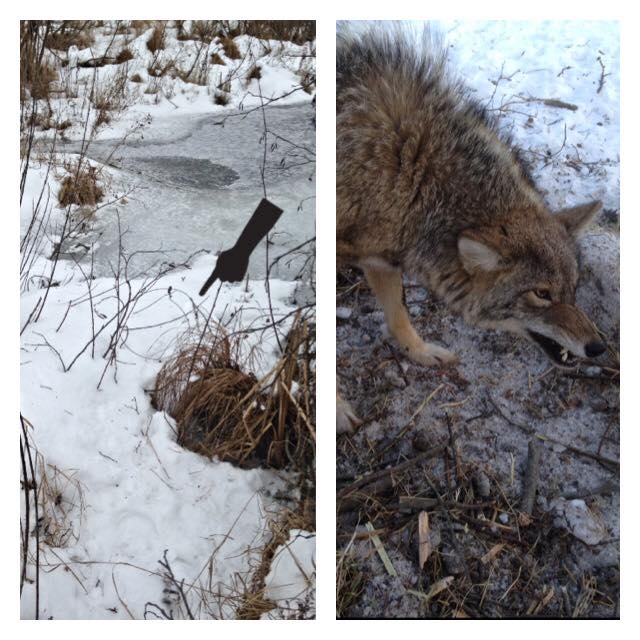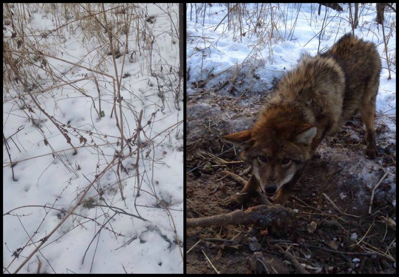| Male coyote in a cable restraint that hung for 17 nights. |